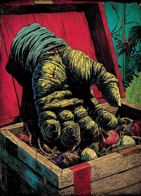 He sat alone in the darkness, gazing at the dying fire, and seeing faces in it. The last face was so horrible and so simian that he gazed at it in amazement. It got so vivid that, with a little uneasy laugh, he felt on the table for a glass containing a little water to throw over it. His hand grasped the monkey’s paw, and with a little shiver he wiped his hand on his coat and went up to bed.