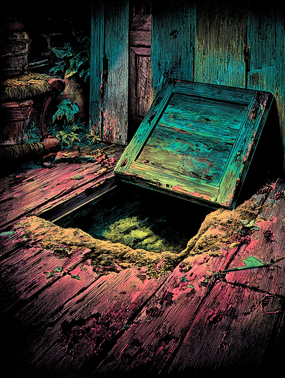 I then took up three planks from the flooring of the chamber, and deposited all between the scantlings. I then replaced the boards so cleverly, so cunningly, that no human eye — not even his — could have detected any thing wrong. There was nothing to wash out — no stain of any kind — no blood-spot whatever. I had been too wary for that. A tub had caught all — ha! ha!